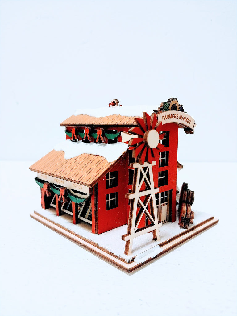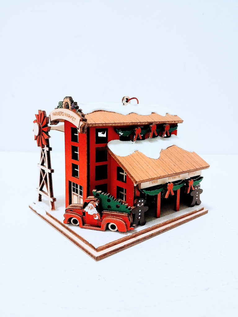 The enchanting Farmer's Market ornament, a delightful holiday treasure designed with a small hole on its underside, ready to borrow a standard bulb from your tree to light up the festive market scene. Unlock its secrets and discover 6 hidden trees and a hidden sunflower, each adding a touch of whimsy and wonder to the vibrant setting. A whimsical addition to your Christmas tree, brimming with hidden delights and festive imagery